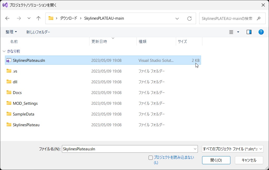 ② SkylinesPLATEAU-mainフォルダに保存されているソリューションファイル(SkylinesPlateau.sln)をVisual Studioで開きます。