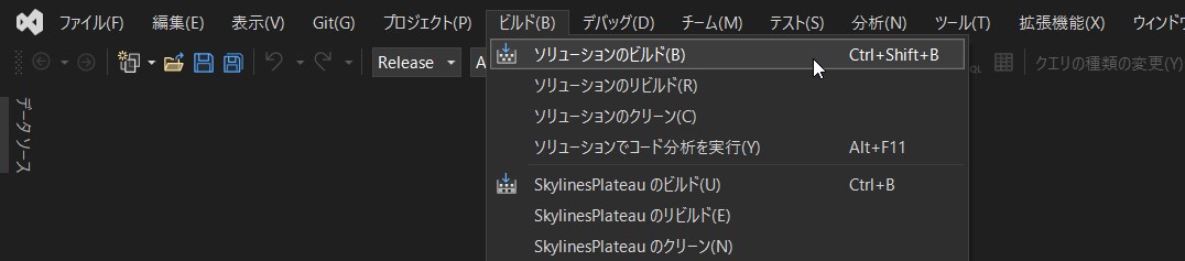 ④ 「ビルド」メニュー>「ソリューションのビルド」を選択し、ソリューション全体をビルドします。